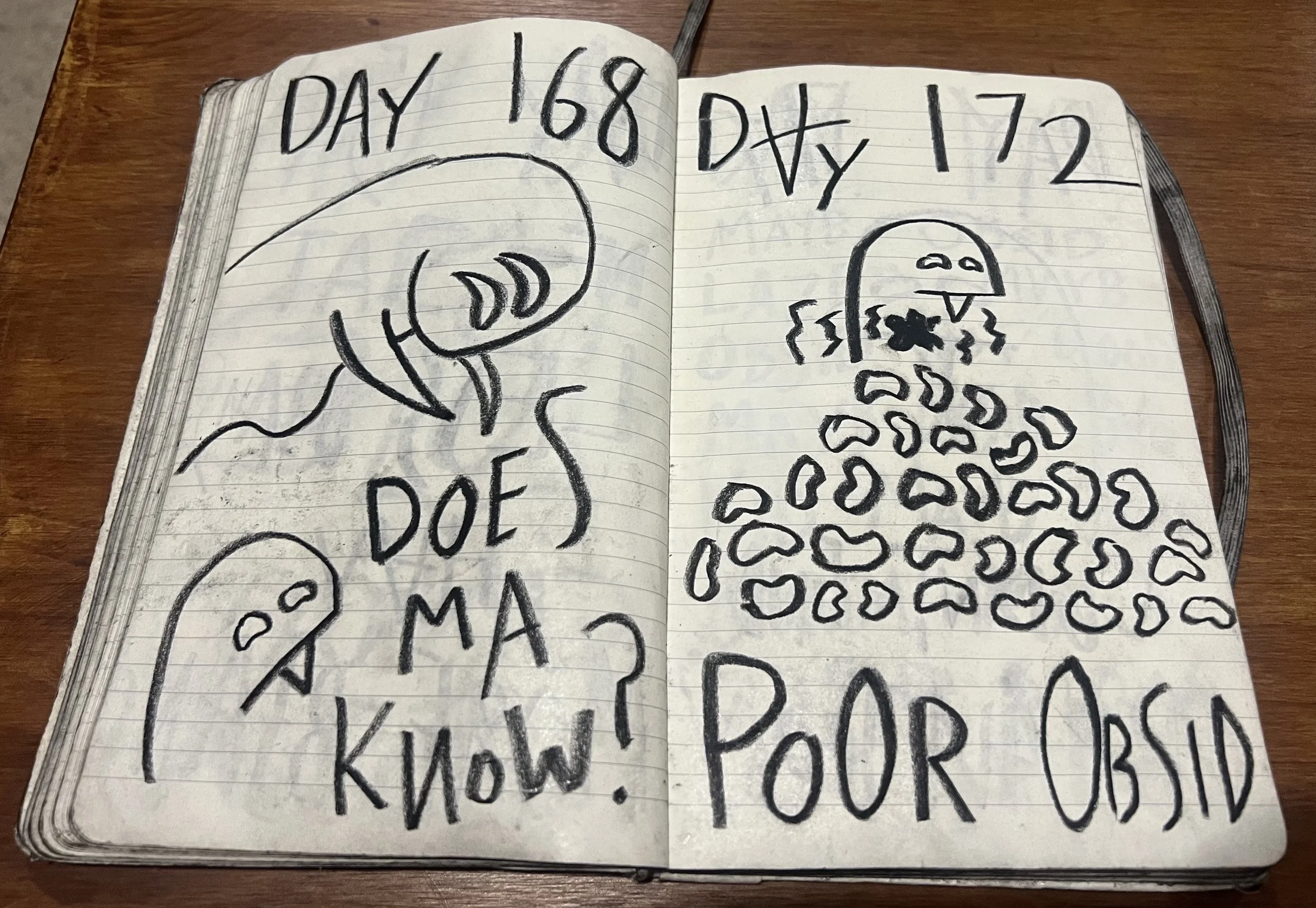 One of the props in BOTO was a 227 page hand drawn diary that revealed the backstory of the performance’s resident ghoul, Obsid. Replicas of the diary were published in a limited pressing and sold to fans of the show. Now that Bottom Of The Ocean is closed, a PDF file of Obsid’s diary is available to all, downloadable here for free.
