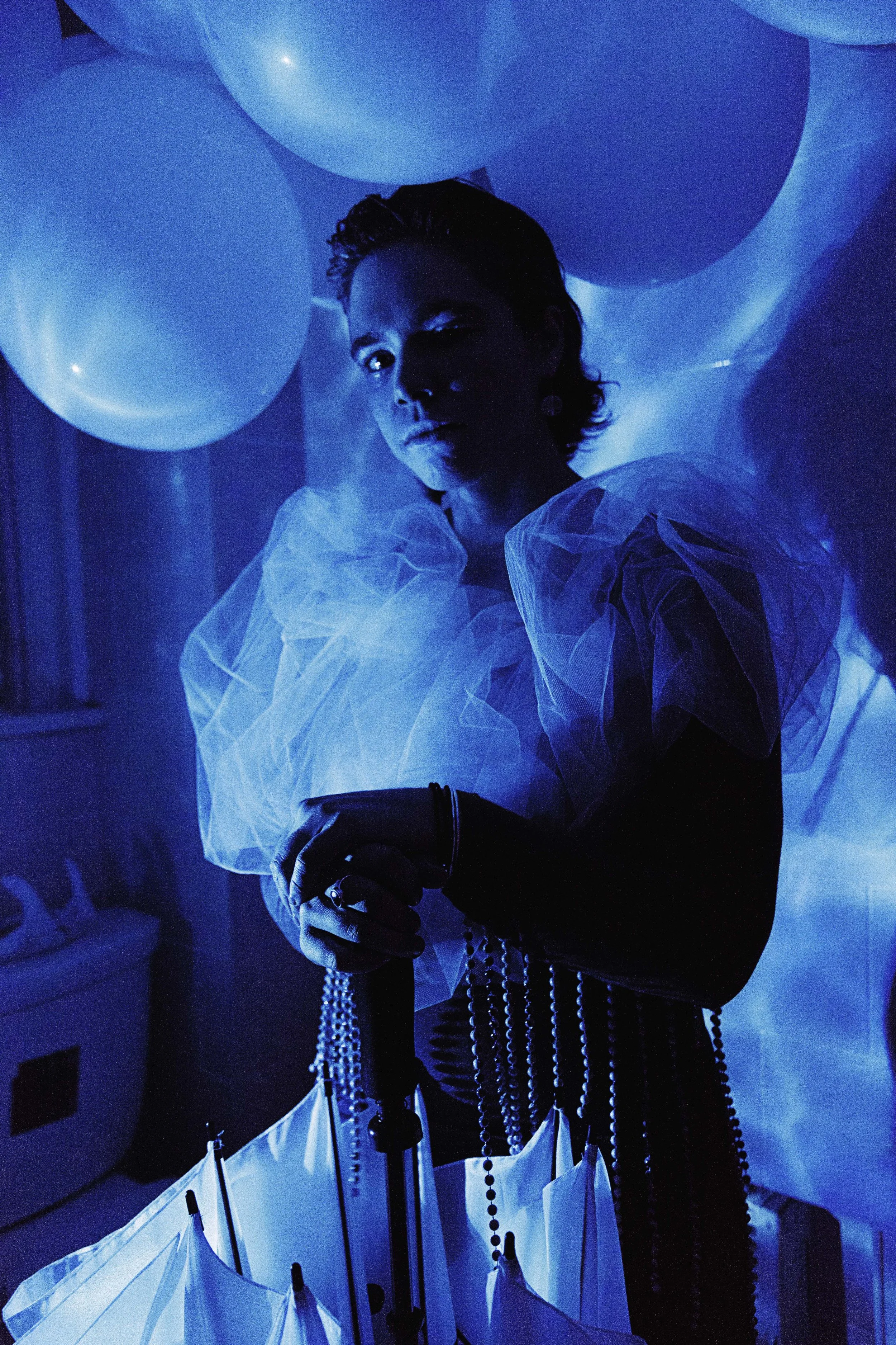 The audience’s first encounter with the surreal. The centerpiece performer of the waiting chamber. Will likely play the cello with a bow, and the drums. Statuesque. Anodyne’s costume will evolve twice over the course of their set. At one point, they will gain or lose a cape. At another point, they will gain or lose a headpiece.